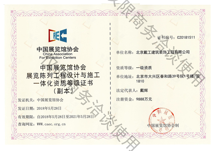 中國展覽館協會展覽陳列工程設計與施工一體化壹級資質